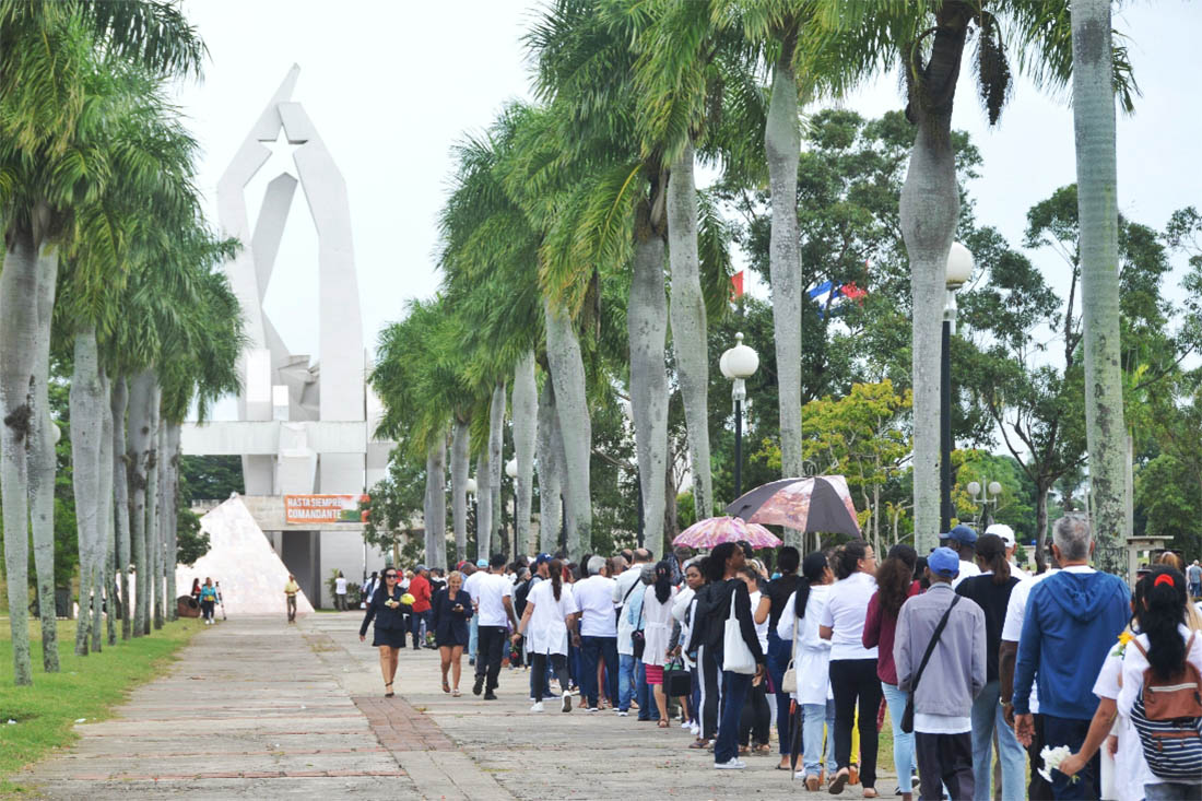 El sitial sagrado en el Salón Jimaguayú, donde se resguardaron las cenizas de Fidel la noche del 4 de diciembre en su tránsito hacia Santiago de Cuba, acogió a miles de lugareños, que en fila ordenada, pasaron ante los restos y la imagen invicta para ofrecer una flor como muestra de cariño y respeto, hacia el líder eterno de la Revolución Cubana.
